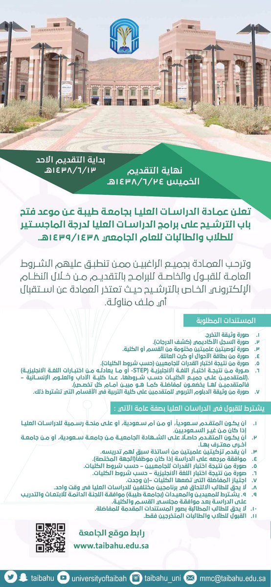 الـ قـ بـ ول و التسجيل On Twitter اعلان عمادة الدراسات العليا بـ جامعة طيبةتعلن عن مواعيدالتقديم على برامج الدراسات العليا بوابة القبول الإلكتروني Https T Co 3winhwn8it Https T Co Pagvhvsohi