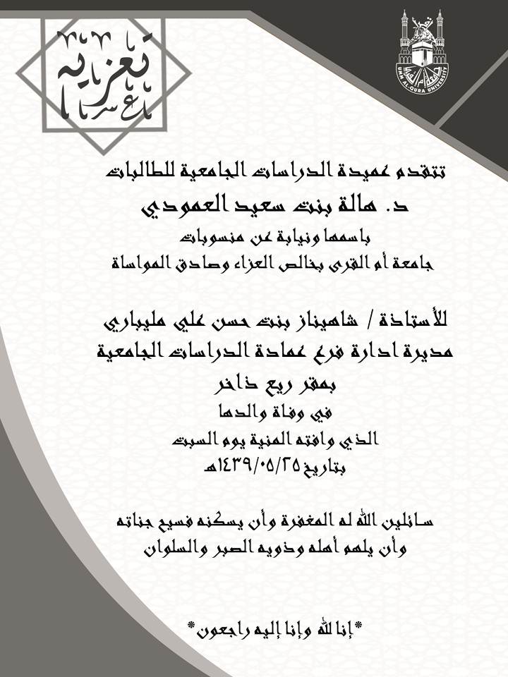 تعزية ومواساة للأستاذة شاهيناز بنت حسن مليباري عمادة الدراسات الجامعية للطالبات وكالة الجامعة لشؤون الطالبات جامعة أم القرى