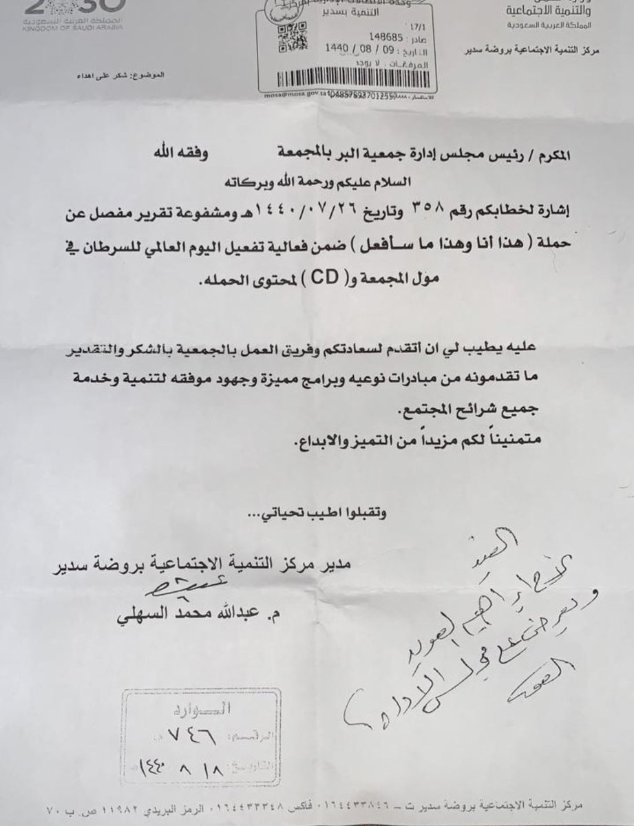 جمعية البر بالمجمعة Twitterren تلقت الجمعية خطاب شكر وتقدير من مركز التنمية بروضة سدير لمشاركة الجمعية في حملة هذا أنا وهذا ما سأفعل ضمن فعالية اليوم العالمي للسرطان في مول