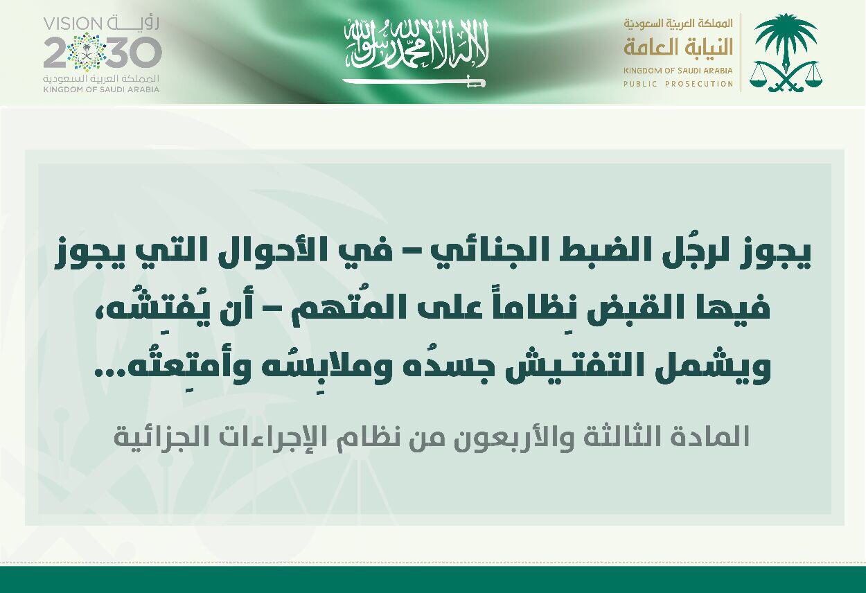 ا لـ ـنـ ـيـ ـا بـ ـة ا لـ ـعـ ـا مـ ـة No Twitter النيابة العامة في الأحوال التي يجوز فيها القبض على المتهم يجوز تفتيش جسده وملابسه وأمتعته