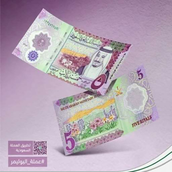 السعودية تطرح عملة من فئة 5 ريالات مصنوعة من البوليمر البلاستيكية و تحتوي على زخارف مستمدة من شعار رؤية المملكة 2030